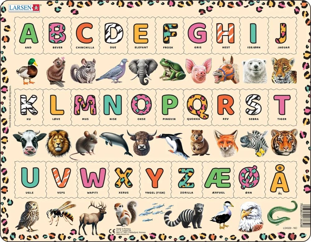 Eit fint puslespel med fine illustrasjonar, som vil fort bli populært. Barnet får trena koordinasjonsevna, samstundes som det lærer bokstavar og bokstavlydar.