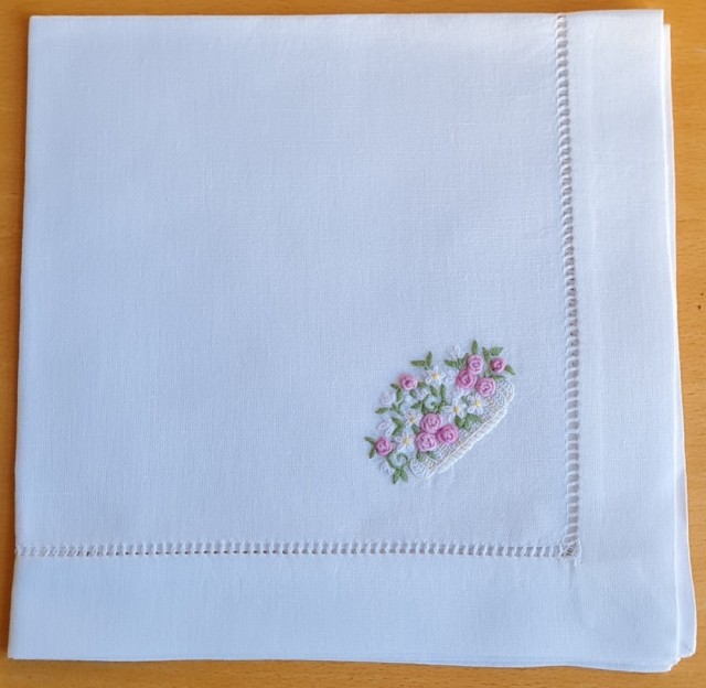 Eksklusiv serviett, brodert for hand på kvit lin. Holsaumen rundt er også brodert for hand.