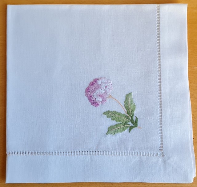 Eksklusiv serviett, brodert for hand på kvit lin. Holsaumen rundt er også brodert for hand.